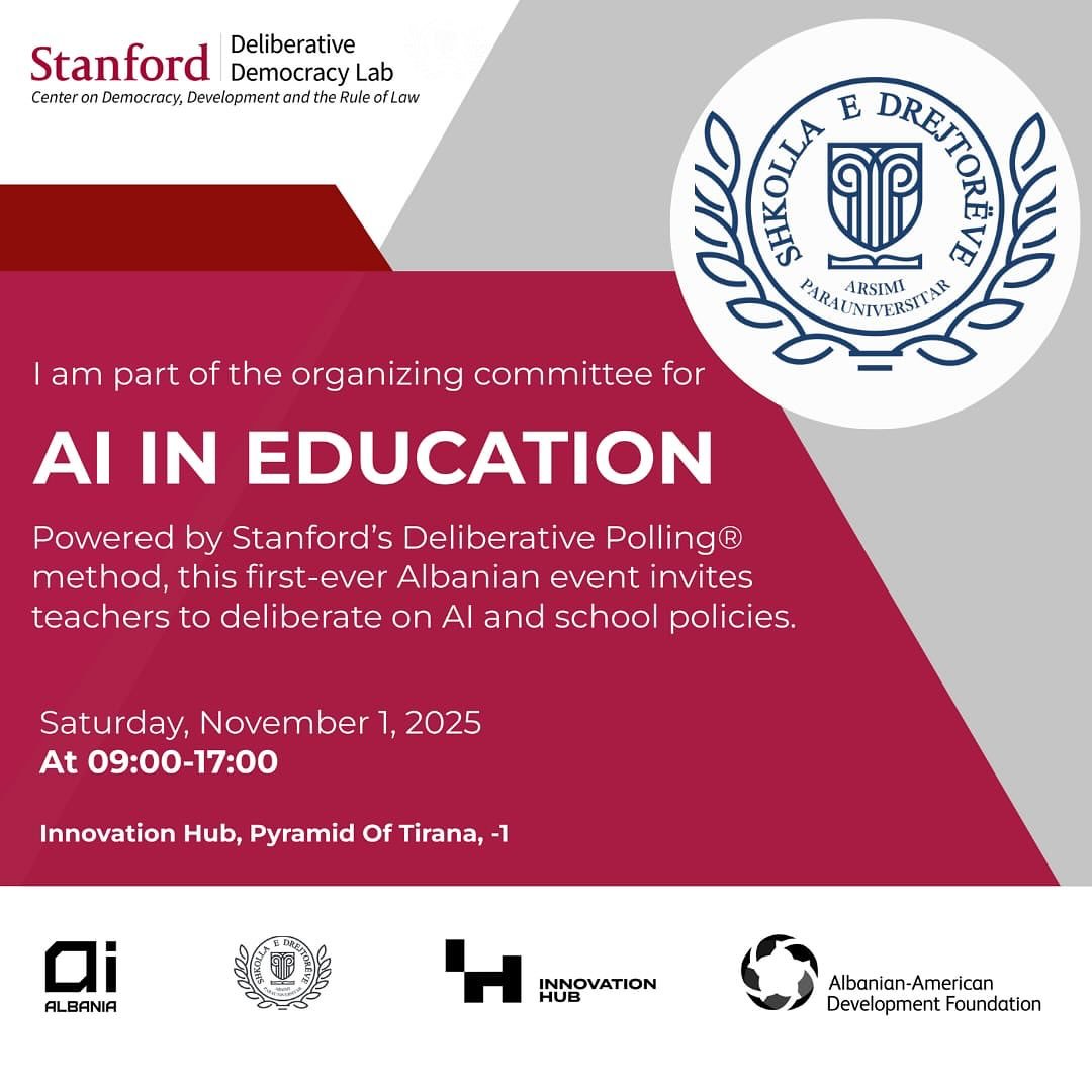 This pioneering initiative, conducted for the first time in Albania using the Stanford University Deliberative Democracy methodology, engaged a group of 320 participants — including school principals, teachers, and education professionals — who reflected on how artificial intelligence is influencing teaching and learning processes.